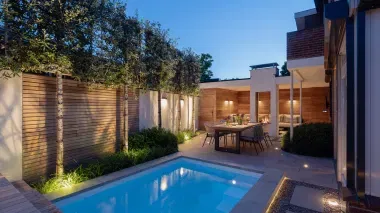Ruime en rustige vlakverdelingen, waarin materialen elkaar subtiel afwisselen, geven een kalme sfeer. De ranke overkapping draagt dezelfde architectuur als de woning en de pergola's, waardoor dit een rustige overgang biedt.