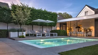 Midden in de tuin ligt het zwembad, dat meer is dan alleen een plek om af te koelen. In het water zijn zitjes geïntegreerd die een bar vormen. Aan de rechterkant lonken de sunbeds, klaar voor een middag zon, terwijl links van het zwembad een sfeervolle zitkuil is gecreëerd.